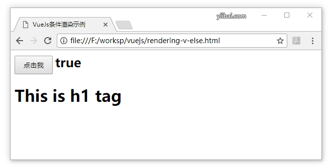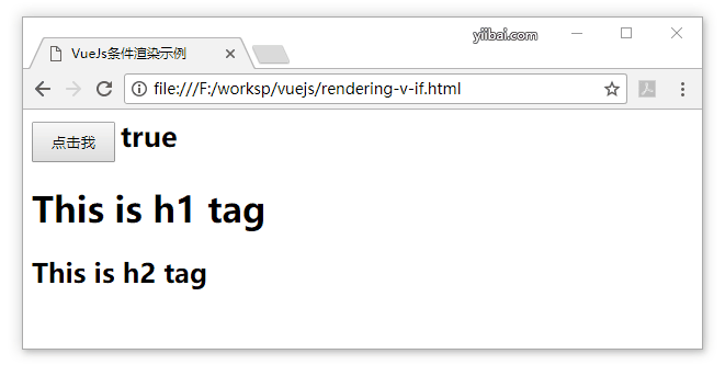 现在,如果show为true,则显示"this is h1 tag",如果show为false,则显示为"this is h2 tag",下面是将在浏览器中看到的效果 -