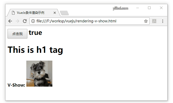 <div v-show = "show"><b>v-show:</b><img src = "images/mydog.jpg" width = "100" height = "100" /></div>