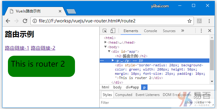const route2 = { template: '<div style = "border-radius:20px;background-color:green;width:200px;height:50px;margin:10px;font-size:25px;padding:10px;">this is router 2</div>' }