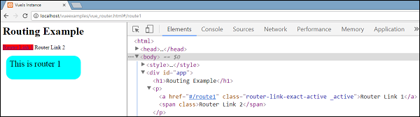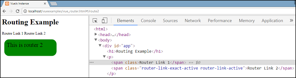 执行示例并查看浏览器中的显示。 在检查和检查路由器链路时,发现它将类添加到活动元素,如下面的截图所示 -