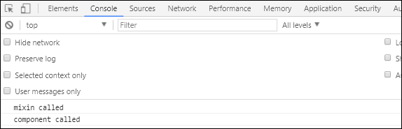 现在mixin和vue实例创建了相同的方法。下面是在控制台中看到的输出。如下所见,vue和mixin的选项将被合并。