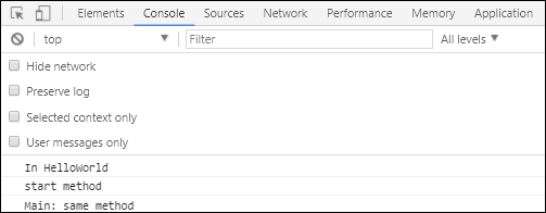 如上所示,已经调用了helloworld,start和same方法。 同样的方法也存在于mixin中,但优先级将赋予主实例,如下面的控制台所示。