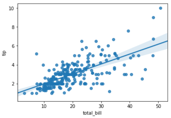 seaborn找到线性回归关系的函数是regplot。 下面的例子显示了它的用法。
