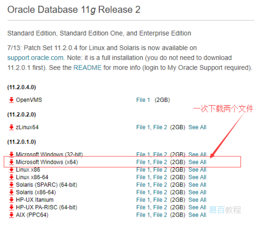首先,需要到oracle官方网站下载oracle数据库,在这里我们将下载oracle 11g第2版的microsoft windows(x64)版本。由于安装文件过大,可以分两个文件下载或一次性下载,如下图所示 -