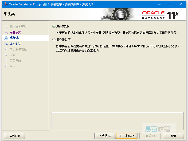 如果要在笔记本电脑或桌面上安装oracle数据库,请选择第一个选项【桌面类】,否则选择第二个选项,然后单击【下一步】按钮。