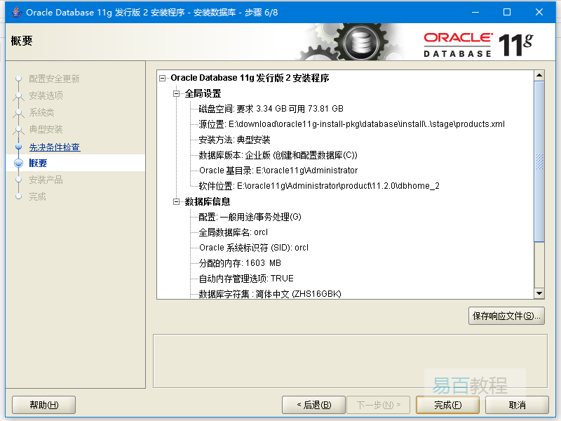 此步骤将显示上一步骤检查的摘要信息,单击【完成】按钮开始安装oracle数据库。