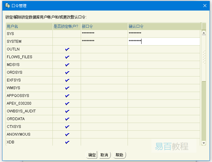单击【口令管理】按钮设置不同用户的密码,这里我们将sys,system和hr用户解锁并设置相应的密码 -