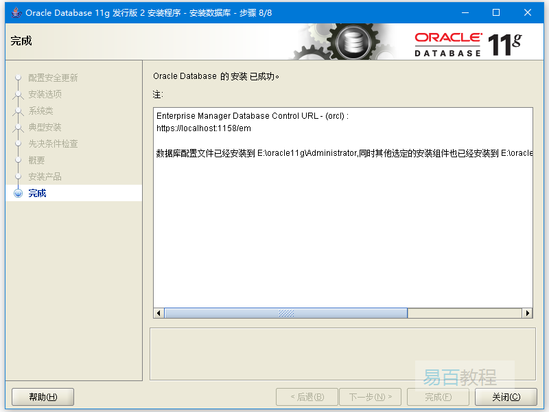 安装过程完成后,单击【关闭】按钮来关闭安装程序。到此,oracle 11g已经成功安装好了。