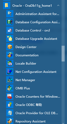 如果上面安装步骤正常通过,在【开始】->【所有应用】将看到oracle文件夹如下: