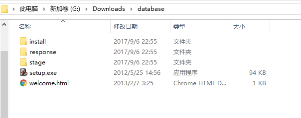 要在计算机上安装oracle数据库,需要从oracle网站的下载页面下载安装程序。如这里下载到文件夹:d:/downloads/ ,其文件名称为:winx64_12201_database.zip, 下载zip格式的安装文件后,需要将其解压缩到计算机上的某个文件夹(d:/downloads/databases)中,下图显示了提取后oracle安装文件的文件夹的结构 -