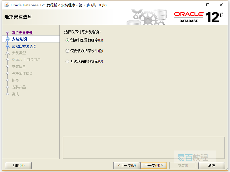 第2步 - 在这一步中,oracle安装程序会询问您是要创建和配置数据库,仅安装数据库软件还是仅升级现有数据库。因为首次安装oracle数据库,请选择第一个选项(create and configure a database),然后单击下一步按钮。