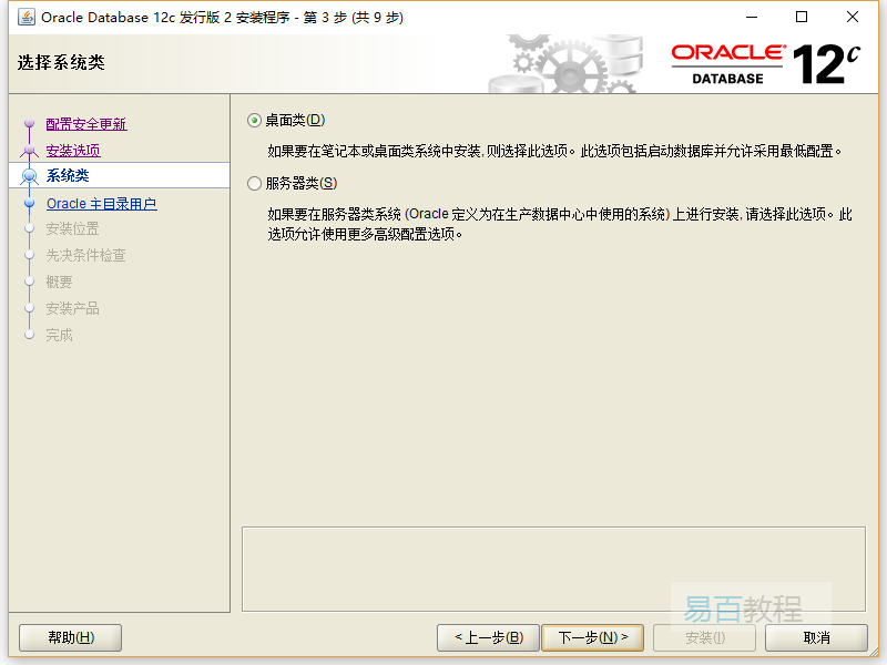 第3步 - 安装程序允许您选择系统类型。因为我们是在桌面计算机上安装oracle,而不是服务器,因此,这里选择第一个选项:桌面类(desktop class),然后单击下一步按钮。