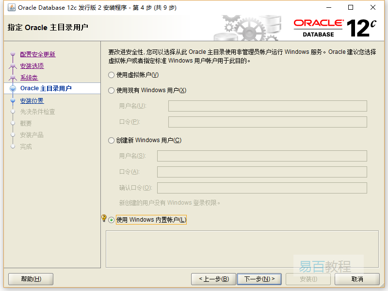 第4步 - 在这一步骤中,允许指定要安装和配置oracle home以增强安全性的windows用户帐户。选择第三个选项:“使用windows内置帐户(use windows built-in account)”。