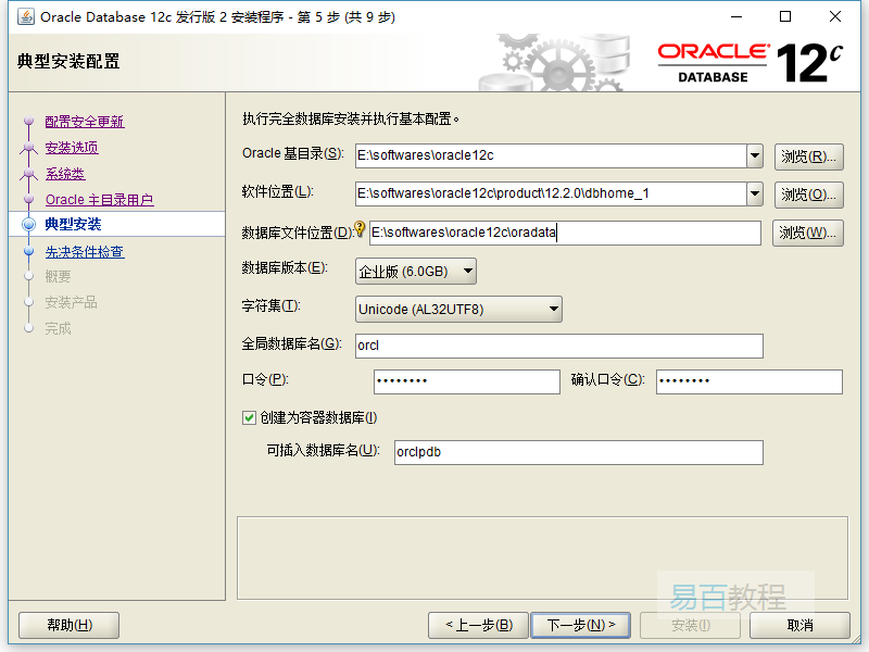 第5步 - 在此步骤中,选择要安装oracle数据库的文件夹,全局数据库名称和密码,可插拔数据库名称。