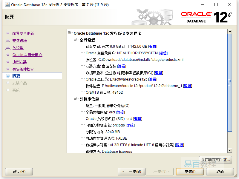 第7步 - 安装程序会显示信息的摘要,例如全局设置,数据库信息等。如果一切正常,可查看信息并单击安装按钮。