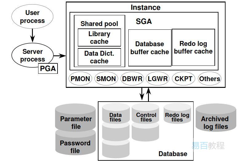 oracle数据库服务器由一个数据库和至少一个数据库实例组成。 数据库是一组存储数据的文件,而数据库实例是一组管理数据库文件的内存结构。 另外,数据库由后台进程组成。