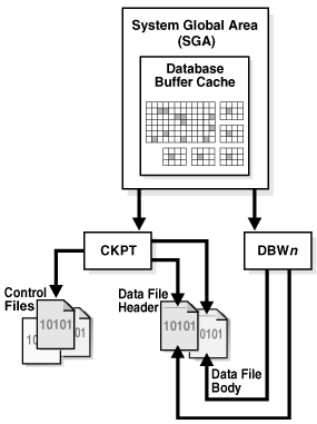 dbw0,dbw1,dbw2等等。 - ckpt 是检查点过程。 在oracle中,磁盘上的数据称为块,内存中的数据称为缓冲区。 当该块写入缓冲区并更改时,缓冲区变脏,需要将其写入磁盘。ckpt进程使用检查点信息更新控制和数据文件头,并向脏盘写入脏缓冲区的信号。 请注意,oracle 12c允许全面和增量检查点。