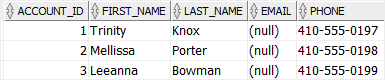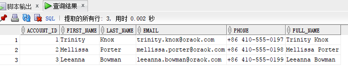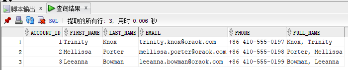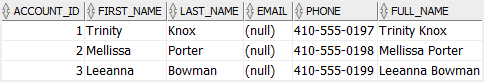 以下语句返回accounts表除了full_name列以外的所有列中返回数据: