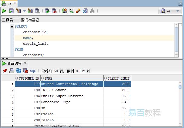 以下示例显示如何从客户(customers)表的customer_id,name和credit_limit列中查询数据。
