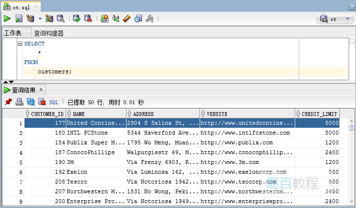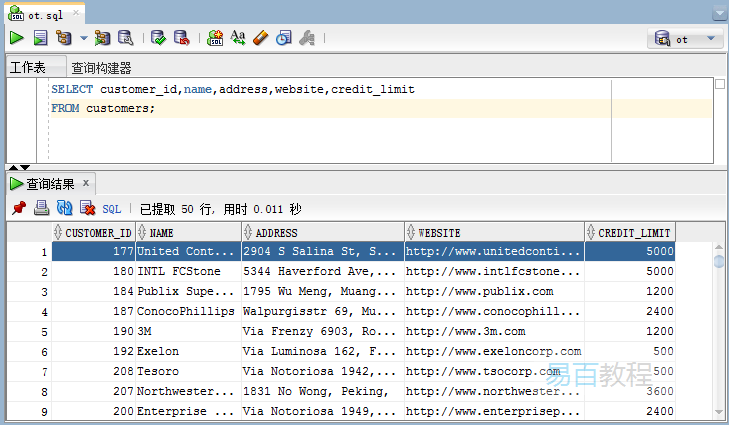 在oracle中,表是由列和行组成。 例如,示例数据库中的customers表具有以下列:customer_id,name,address,website和credit_limit。customers表中这些列中也有对应的数据。