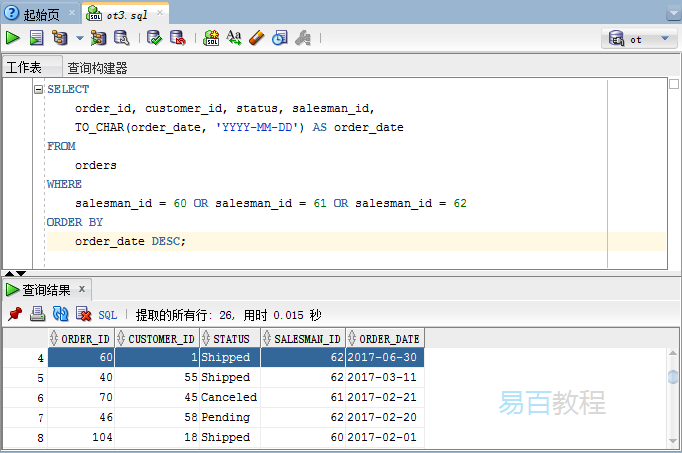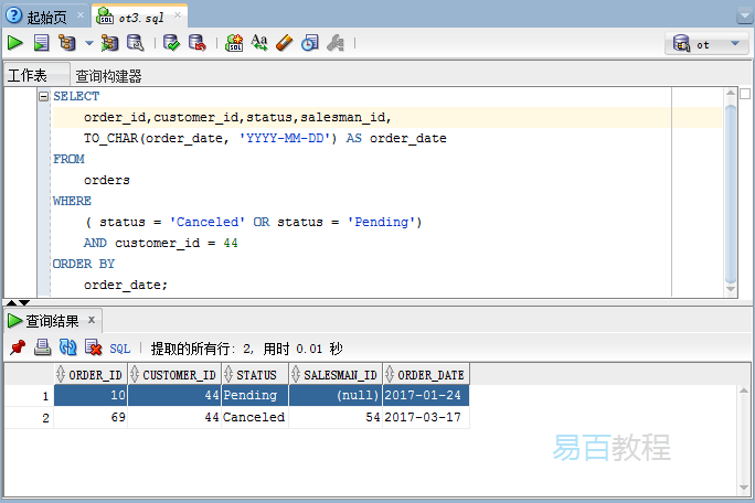 在这个例子中,语句返回了满足下列表达式之一的所有订单: