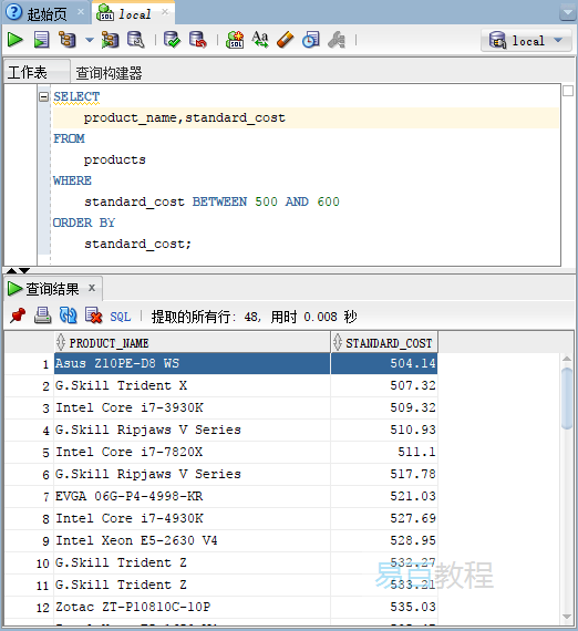 在此示例中,我们将标准成本(standard_cost)列中的值与500(含)到600(含)之间的范围进行比较。该查询仅返回标准成本在以下范围之间的产品: