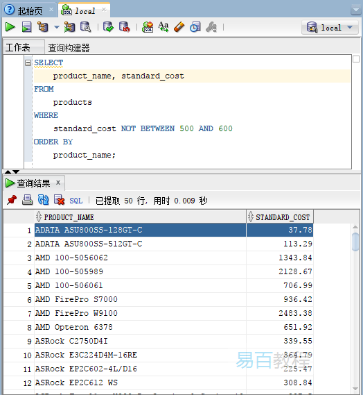 要查询标准成本不在500和600之间的产品,请按如下方式将not运算符添加到上述查询中: