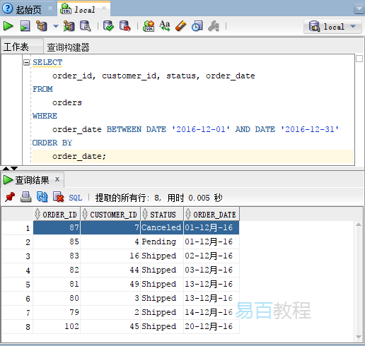 以下查询语句将返回2016年12月1日至2016年12月31日期间客户的订单: