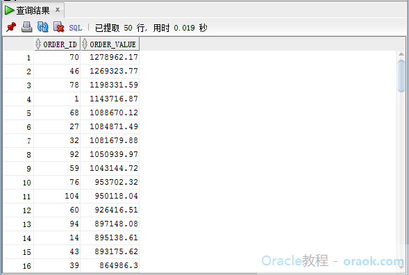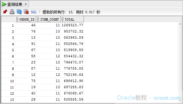 以下语句使用group by子句从order_items表中检索订单及其总金额的值: