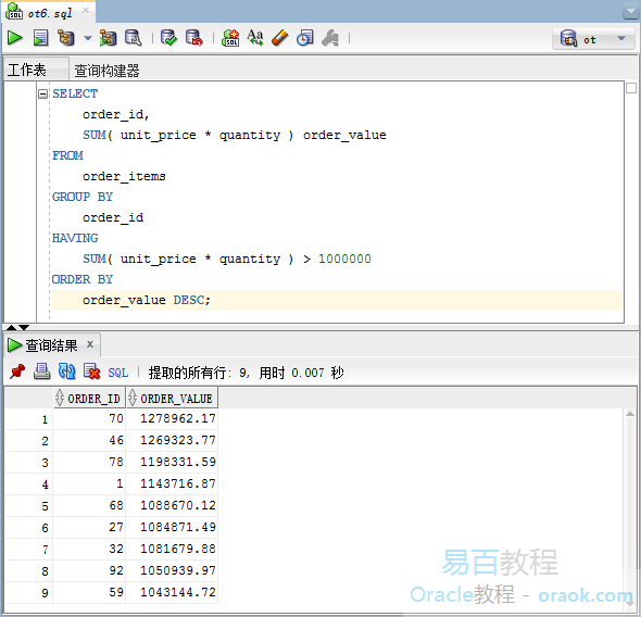 要查找总金额值大于1百万的订单,请按如下所示添加having子句: