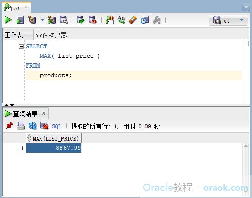 以下查询使用max()函数从products表中返回产品的最高标价: