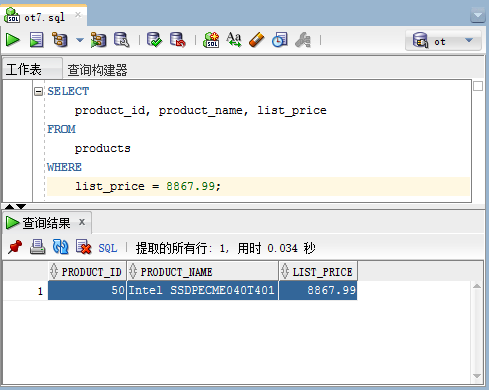 要查询最贵的产品的详细信息,可在以下查询中使用上面的查询出的标价(8867.99):