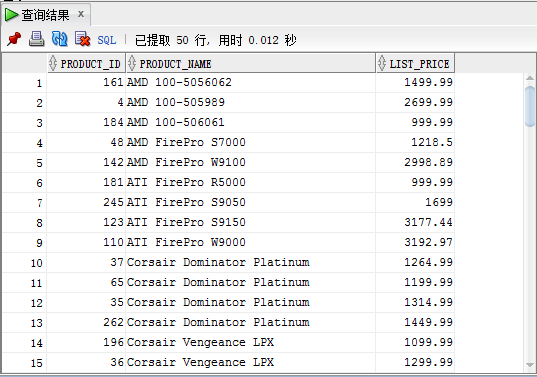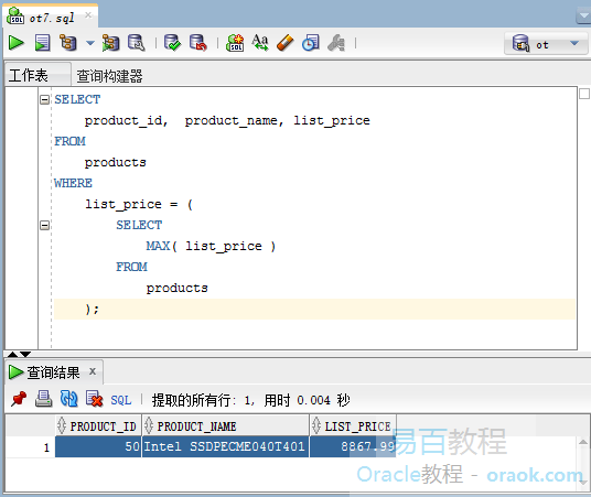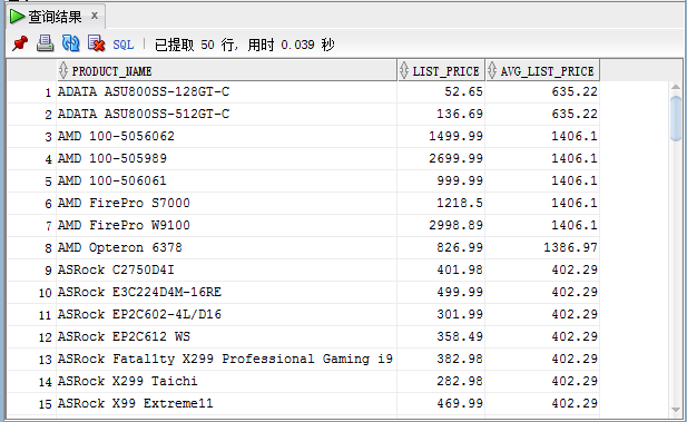 在这个例子中,在select子句中使用了一个子查询来获得同一分类的产品的平均标价。 oracle为外部查询选择的每一行评估(计算)子查询。