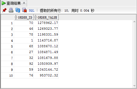 order_value按降序排序的order_id和order_value的列表。10行。使用比较运算符,即,>,>=,<,<=,<>,=的子查询通常包含聚合函数,因为集合函数返回可用于比较的单个值和外部查询。