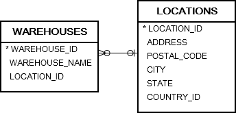 请参阅以下仓库(warehouses)和位置(locations)表,它们之间的er图如下: