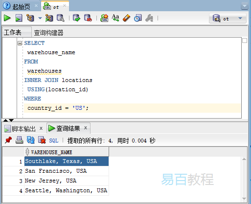 对于每个仓库,子查询检查其位置是否在美国(us)。如果是,则where子句中的exists运算符返回true,使外部查询将字符串",usa"附加到仓库名称。否则,由于条件是where子句为false,update语句将什么都不做。