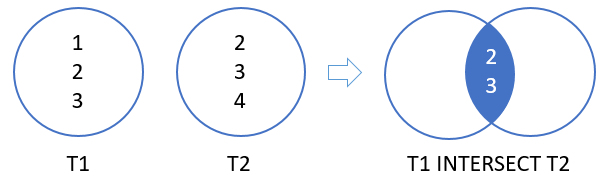t1结果集包括:1,2,3行。t2结果集包括:2,3,4行。t1和t2的相交结果返回是2和3。因为这些是由两个查询输出的不同值。