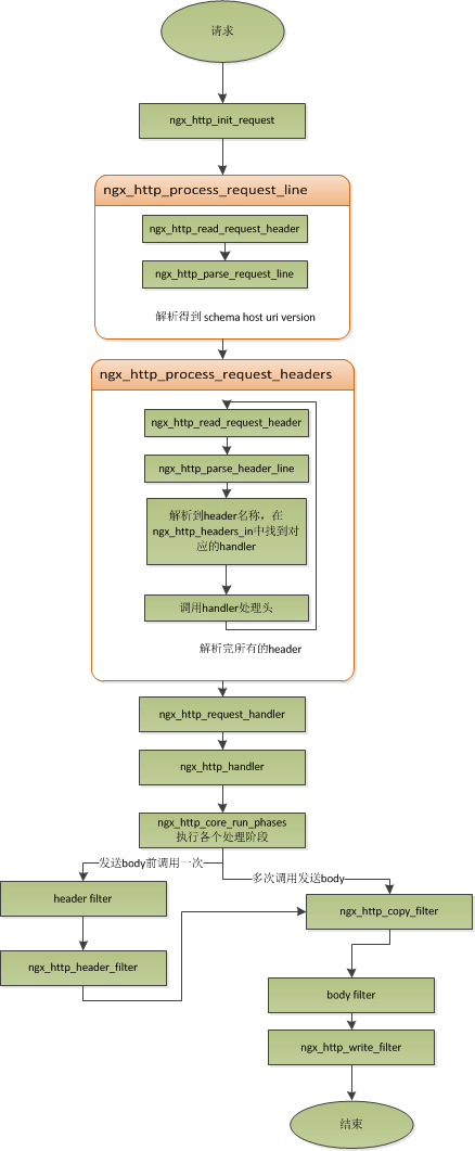 当 nginx 解析到两个回车换行符时,就表示请求头的结束,此时就会调用 ngx_http_process_request 来处理请求了。ngx_http_process_request 会设置当前的连接的读写事件处理函数为 ngx_http_request_handler,然后再调用 ngx_http_handler 来真正开始处理一个完整的http请求。这里可能比较奇怪,读写事件处理函数都是ngx_http_request_handler,其实在这个函数中,会根据当前事件是读事件还是写事件,分别调用 ngx_http_request_t 中的 read_event_handler 或者是 write_event_handler。由于此时,我们的请求头已经读取完成了,之前有说过,nginx 的做法是先不读取请求 body,所以这里面我们设置 read_event_handler 为 ngx_http_block_reading,即不读取数据了。刚才说到,真正开始处理数据,是在 ngx_http_handler 这个函数里面,这个函数会设置 write_event_handler 为 ngx_http_core_run_phases,并执行 ngx_http_core_run_phases 函数。ngx_http_core_run_phases 这个函数将执行多阶段请求处理,nginx 将一个 http 请求的处理分为多个阶段,那么这个函数就是执行这些阶段来产生数据。因为 ngx_http_core_run_phases 最后会产生数据,所以我们就很容易理解,为什么设置写事件的处理函数为 ngx_http_core_run_phases 了。在这里,我简要说明了一下函数的调用逻辑,我们需要明白最终是调用 ngx_http_core_run_phases 来处理请求,产生的响应头会放在 ngx_http_request_t 的 headers_out 中,这一部分内容,我会放在请求处理流程里面去讲。nginx 的各种阶段会对请求进行处理,最后会调用 filter 来过滤数据,对数据进行加工,如 truncked 传输、gzip 压缩等。这里的 filter 包括 header filter 与 body filter,即对响应头或响应体进行处理。filter 是一个链表结构,分别有 header filter 与 body filter,先执行 header filter 中的所有 filter,然后再执行 body filter 中的所有 filter。在 header filter 中的最后一个 filter,即 ngx_http_header_filter,这个 filter 将会遍历所有的响应头,最后需要输出的响应头在一个连续的内存,然后调用 ngx_http_write_filter 进行输出。ngx_http_write_filter 是 body filter 中的最后一个,所以 nginx 首先的 body 信息,在经过一系列的 body filter 之后,最后也会调用 ngx_http_write_filter 来进行输出(有图来说明)。