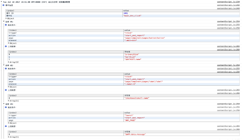 在页面中可以新建、查看或修改事件,在修改事件的页面中编辑完毕后,点击底部的保存并测试按钮将保存当前配置,同时工具将在调试器上提示收到最新配置,并展示配置信息,展示的内容包括事件的 id 和名称,以及每个动作的触发条件和上报数据: